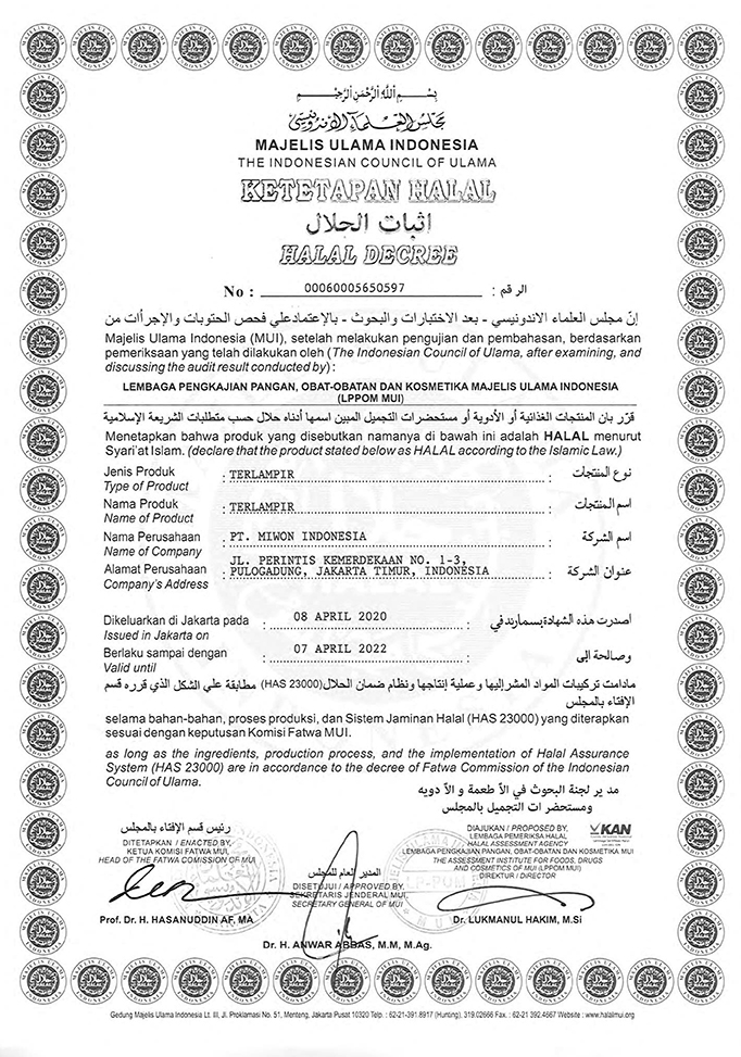 The products that we distribute both local and imports have been approved by the National Agency of Drug and Food Control of Republic of Indonesia or NADFC (BPOM). In addition, the Indonesia Council of Ulama (MUI) has approved these products by issuing the HALAL certificate, so that halal products are guaranteed. Miwon products known just through their high quality, but also accepted within world-wide communities by provision of their requirements. The main products of Miwon, such MSG is certified by HALAL and KOSHER.